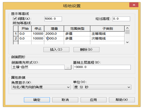 (6)单击“完成表面”按钮完成地形表面模型。选择导入的DWG文件,按Delete键删除该DWG文件。 ![]() (7)单机”体量和场地”选项卡“场地建模”面板名称右侧的斜箭头 弹出“场地设置”对话框,对主次等高线进行设置。如图,revit将按场地设置中设置的等高线间隔重新显示地形表面的等高线。 ![]() (8)在楼层平面视图,修改试图比例1:500。单击“体量和场地”选项卡“修改场地”面板中的“标记等高线”工具,自动切换至“修改|标记等高线”上下文选项卡。