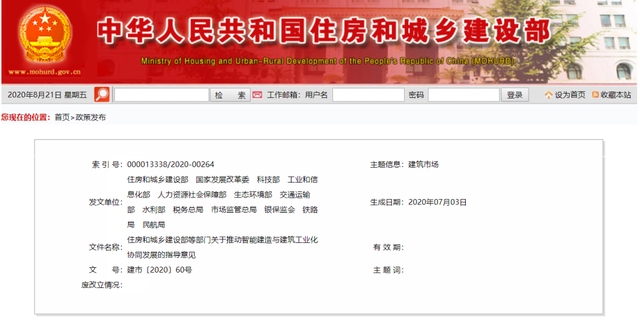 在加快建筑工业化升级方面,《关于推动智能建造与建筑工业化协同发展的指导意见》要求,大力发展装配式建筑,推动建立以标准部品为基础的专业化、规模化、信息化生产体系。