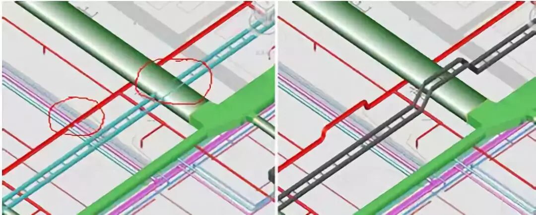 案例3:上述图中,浅蓝色部分是桥架,绿色部分是风管,红色部分是消防水管,图中通过碰撞检查可以看出左图中发生两处比较严重的碰撞,红色圈分别画出错误的部位,一个是防火桥架和风管的碰撞,另外一个是消防水管与其他管道发生碰撞,通过BIM中的碰撞检查可以将它们进行有效地调整,小管优先避让大管,避免在现场中发生管道打架的情况。五、如何全面考虑BIM综合管线服务?