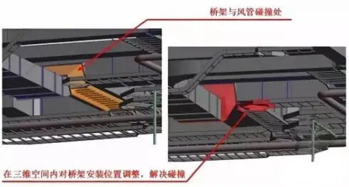 3) 确定了无压管和大管的位置后,余下的就是各类有压水管,桥架等管道。此类管道一般可以翻转弯曲,路由布置较灵活。此外,在各类管道沿墙排列时应注意以下方面:保温管靠里非保温管靠外;金属管道靠里非金属管道靠外;大管靠里小管靠外;支管少、检修少的管道靠里,支管多、检修多的管道靠外。管道并排排列时应注意管道之间的间距。一方面要保证同一高度上尽可能排列更多的管道,以节省层高;另一方面要保证管道之间留有检修的空间。管道距墙,柱以及管道之间的净间距应不小于100mm。根据施工图纸建立建筑、结构、机电BIM模型,利用BIM技术检测建筑与结构之间的碰撞问题,设计不合理问题,有效控制建筑和结构图纸的一致性,避免了在施工过程因建筑和结构设计冲突,造成的返工、拆改。