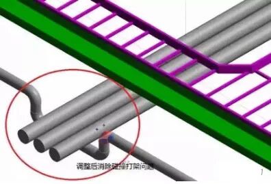 案例2:上图为水管与水管之间的碰撞,灰色部分是水管,可以从图中看出交叉的部分发现打架的问题,需要进行调整,把水管的位置进行碰撞检测从而进行修改,使得在现场施工的时候避免不必要的冲突和错误。